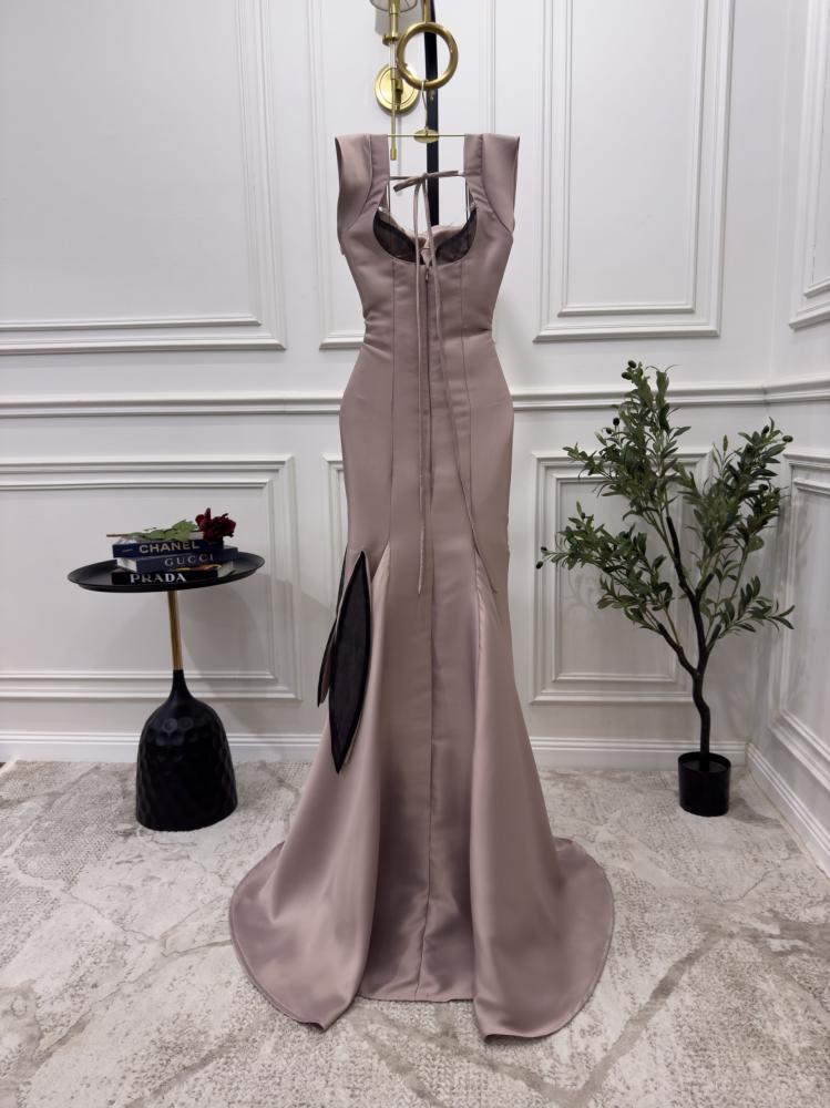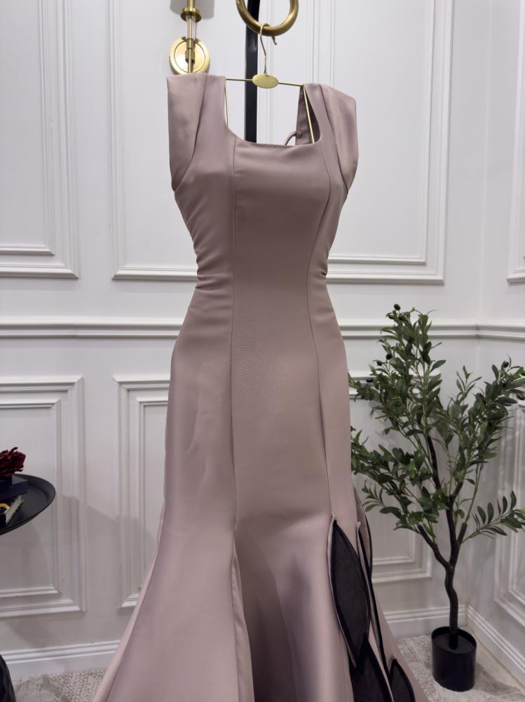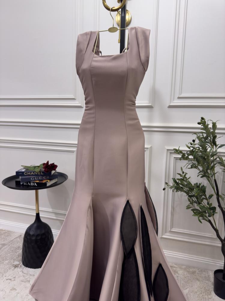 فستان سهرة طويل مصنوع من خامة الميكادو الفاخرة. يتميز الفستان بقصة ملوكية تضفي عليه طابعًا أنيقًا ومبهرًا. الجزء العلوي مصمم بشكل ضيق على الجسم ليبرز جمال القوام، لمسة أنثوية. بدون أكمام .