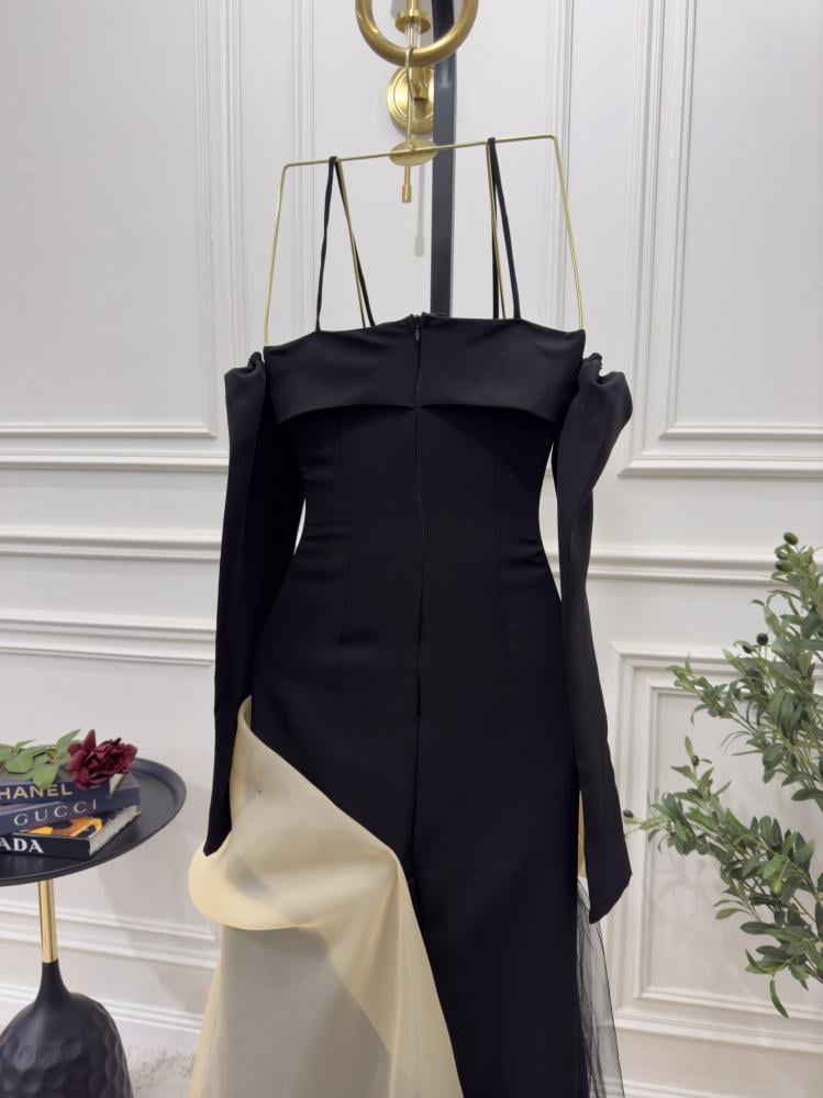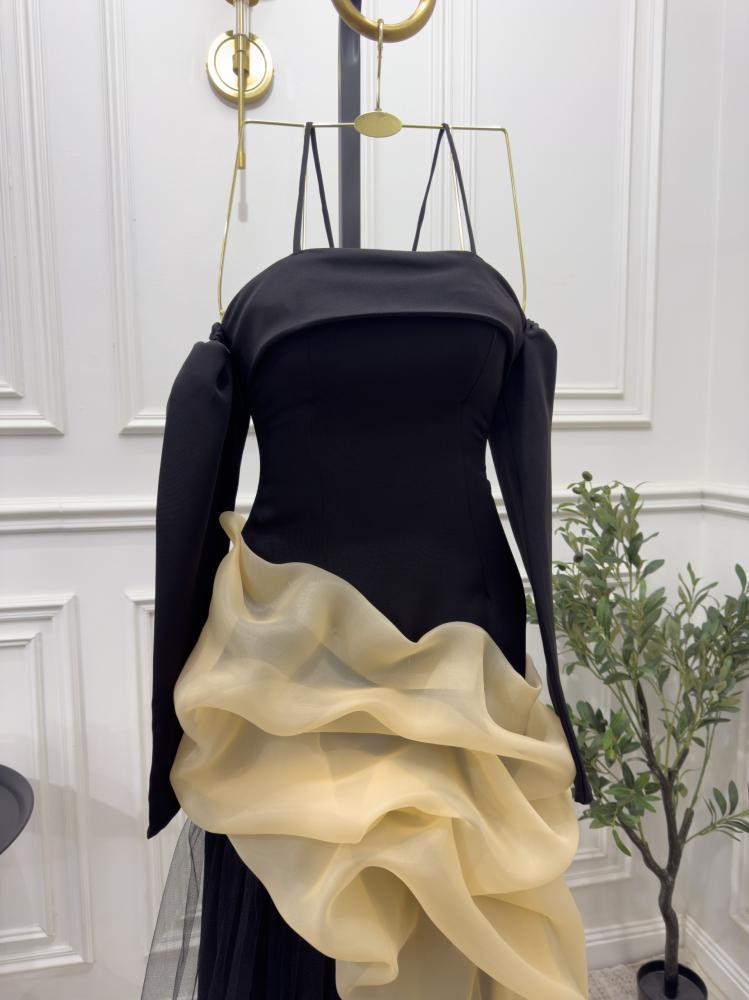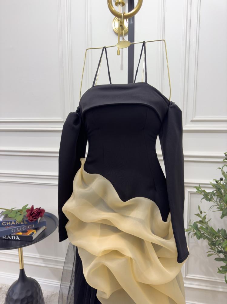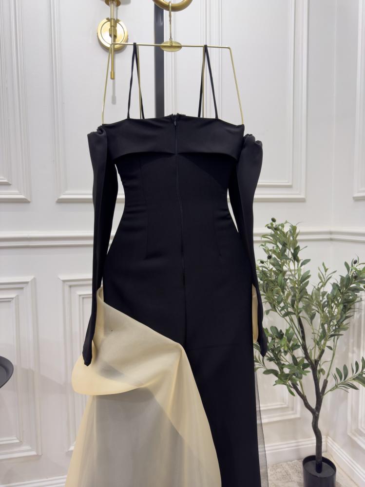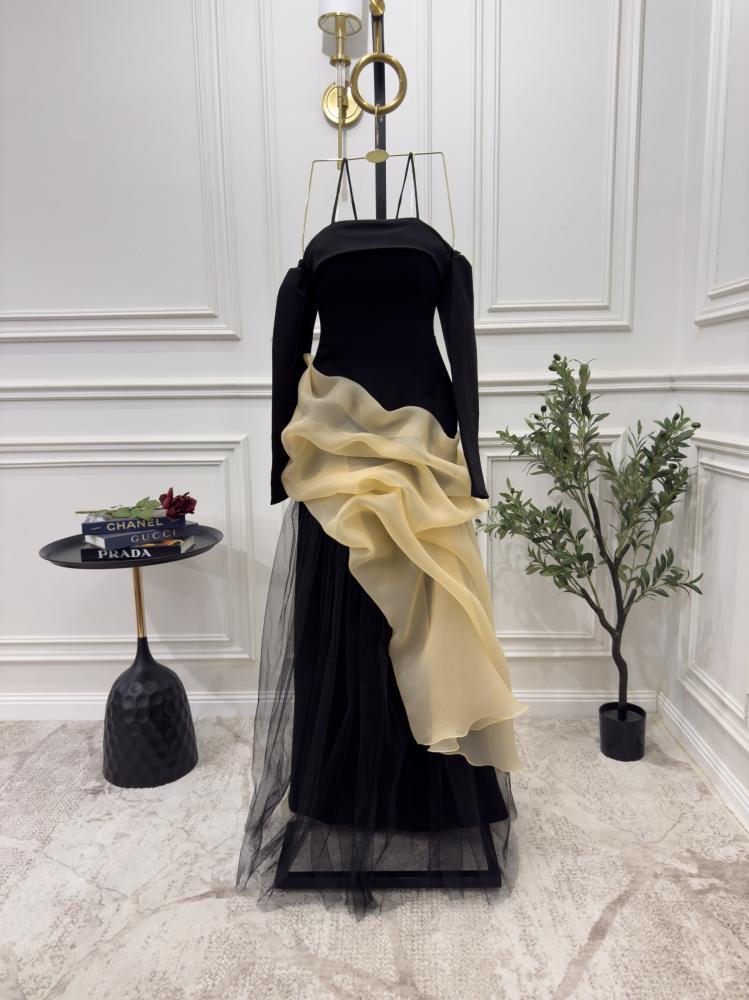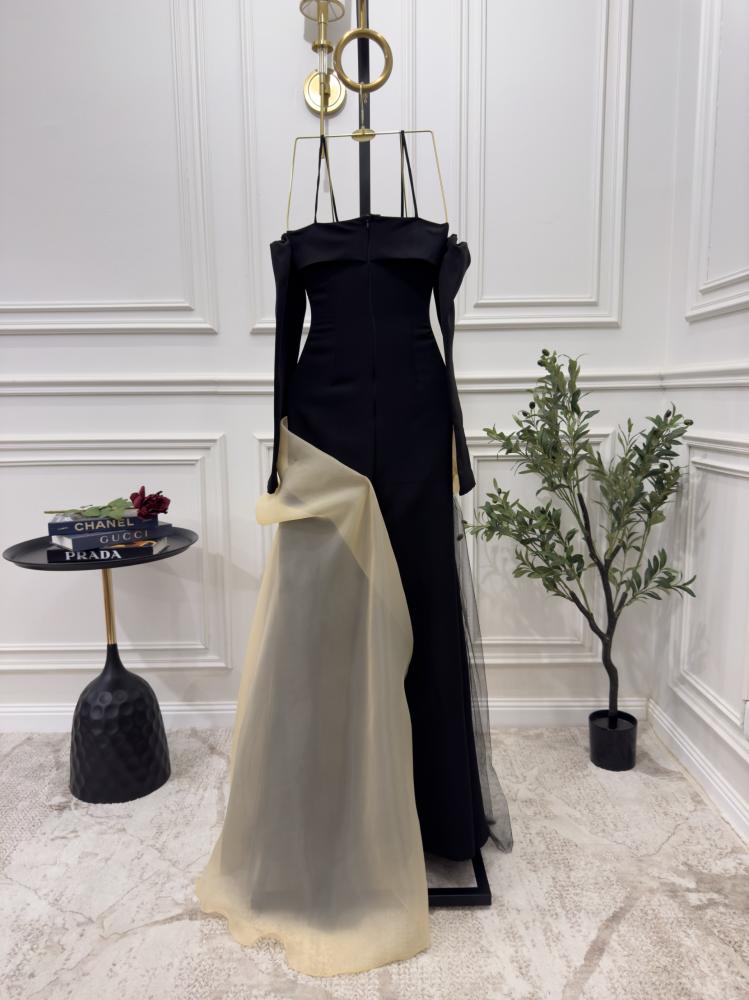 فستان سهرة طويل فاخر . يتميز الفستان بقصة ملوكية تضفي عليه طابعًا أنيقًا ومبهرًا. الجزء العلوي مصمم بشكل ضيق على الجسم ليبرز جمال القوام، لمسة أنثوية.