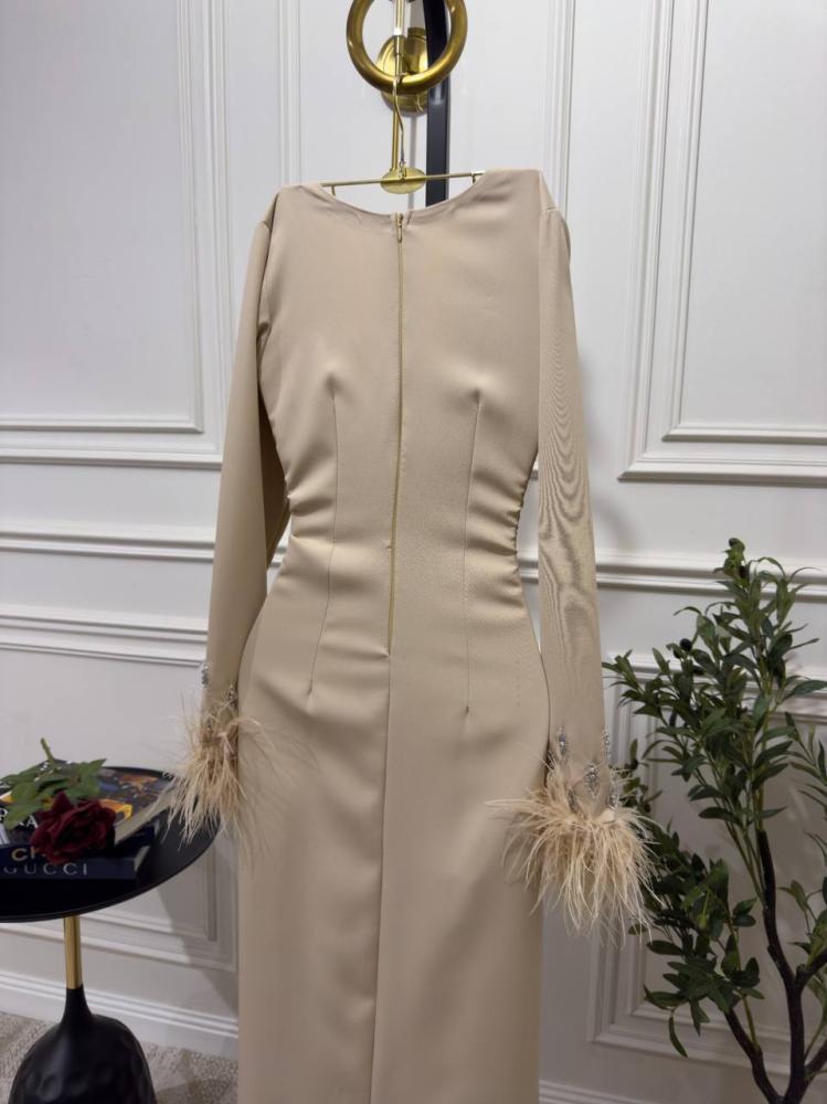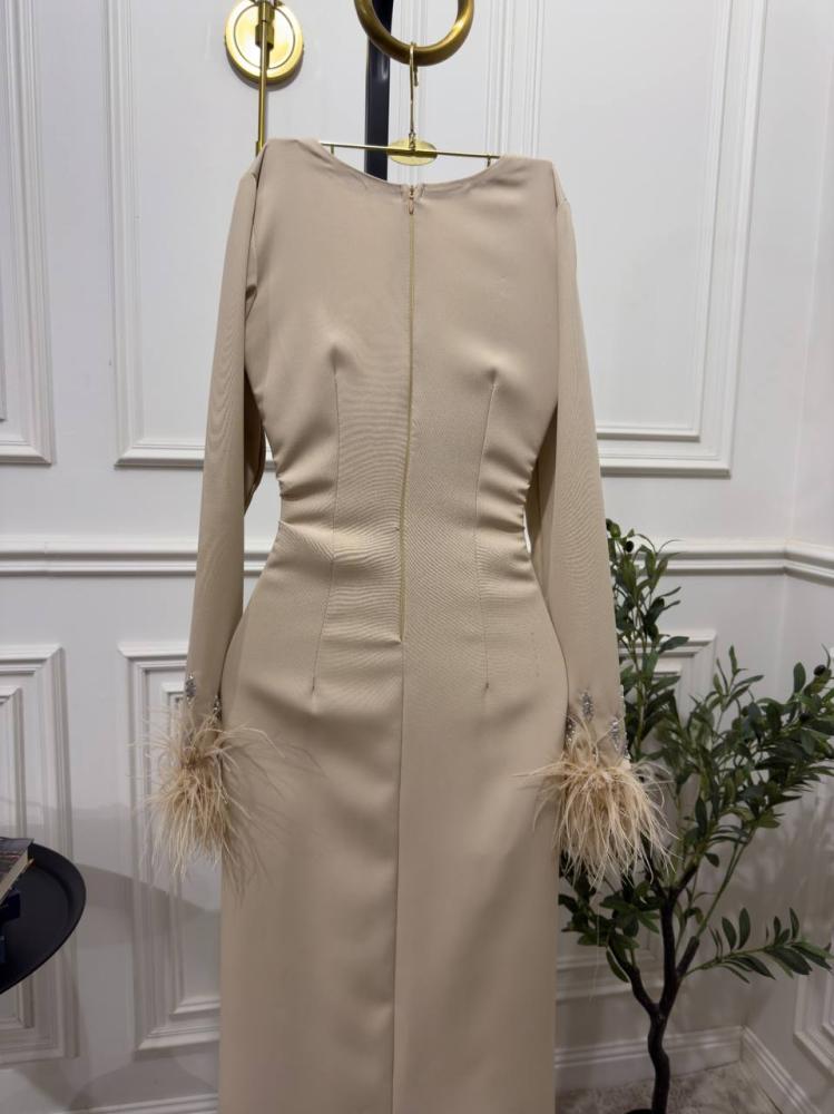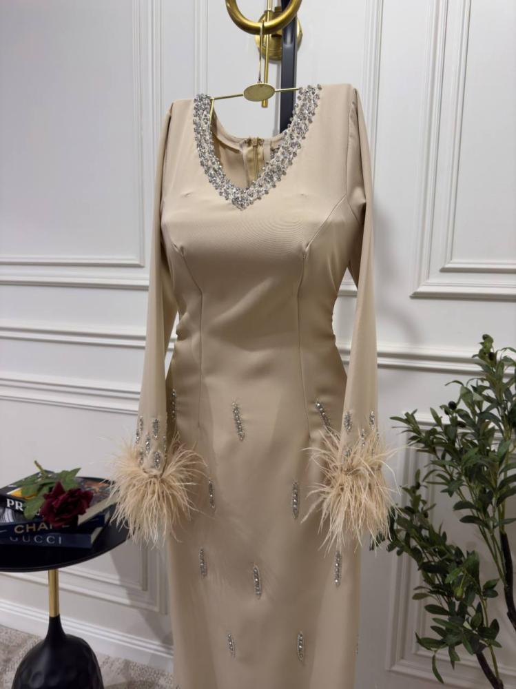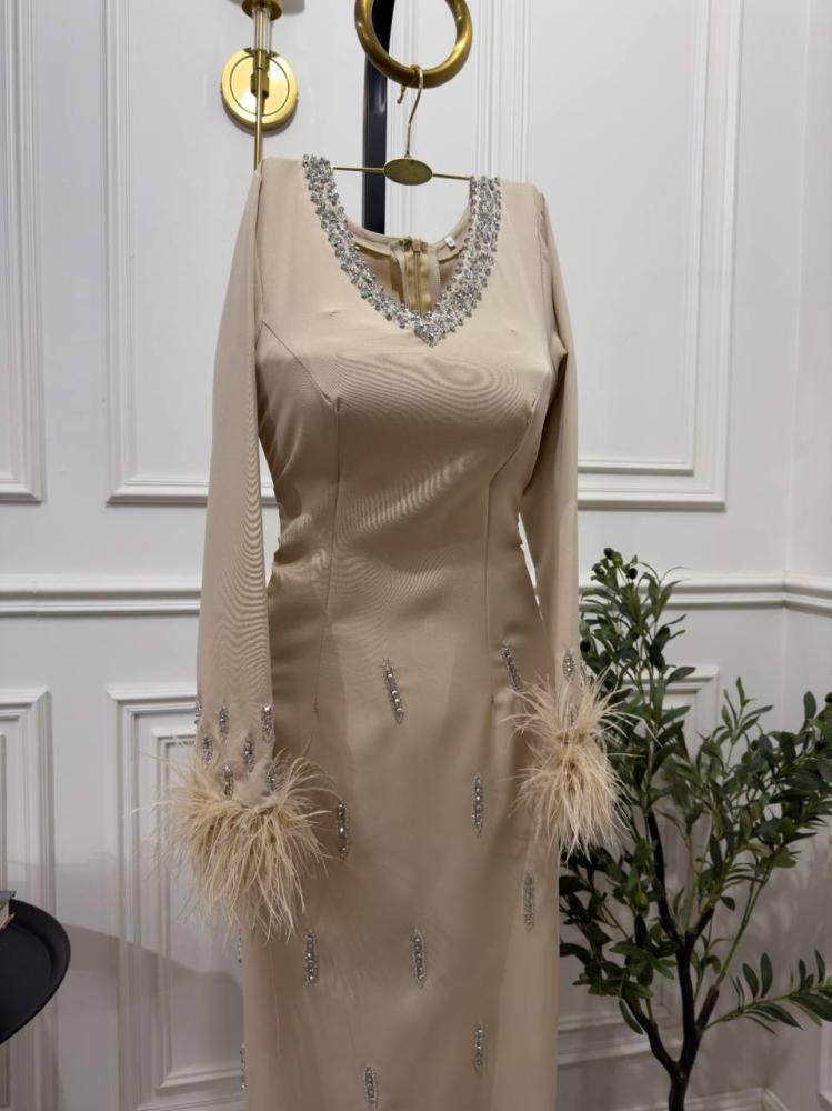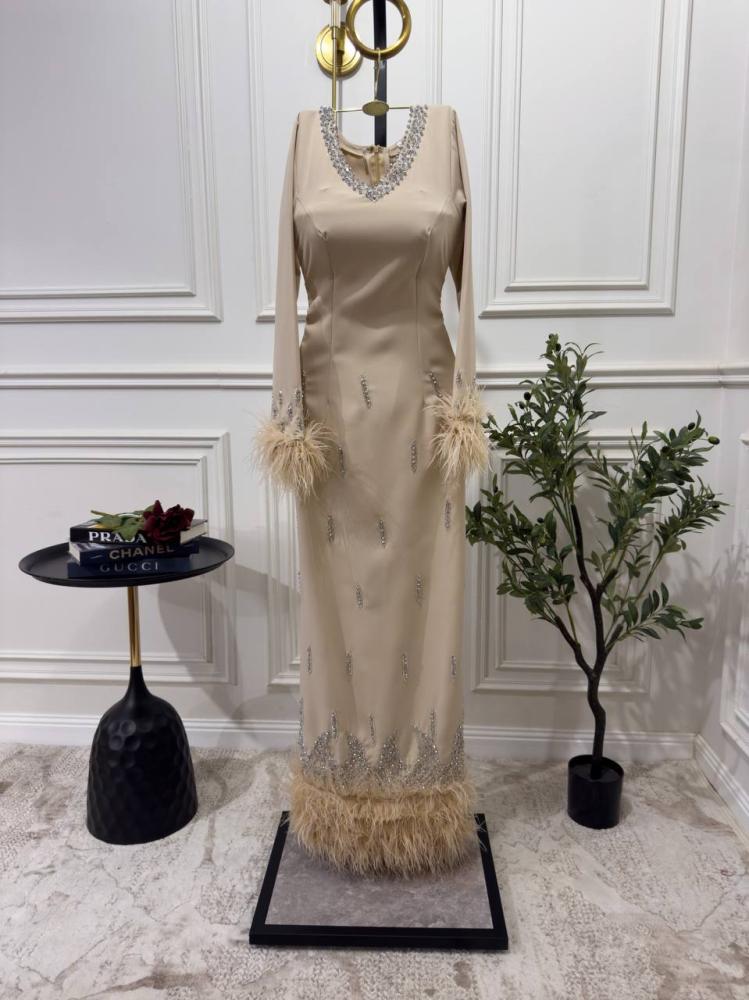 فستان سهرة طويل فاخر . يتميز الفستان بقصة ملوكية تضفي عليه طابعًا أنيقًا ومبهرًا. الجزء العلوي مصمم بشكل ضيق على الجسم ليبرز جمال القوام، لمسة أنثوية.